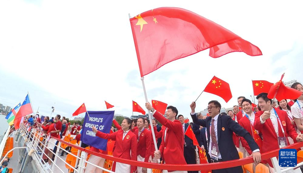 7月26日,中國體育代表團旗手、花樣游泳選手馮雨在開幕式上揮舞國旗。新華社記者 曹燦 攝