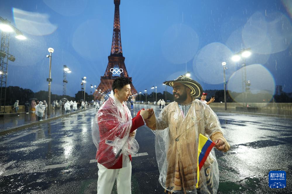 7月26日,中國體育代表團旗手、乒乓球選手馬龍(左)與哥倫比亞體育代表團成員在埃菲爾鐵塔前相互致意。新華社記者 李明 攝