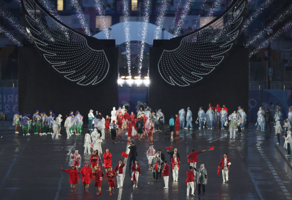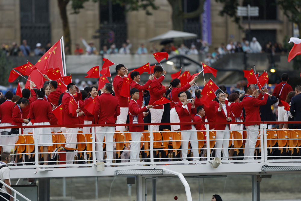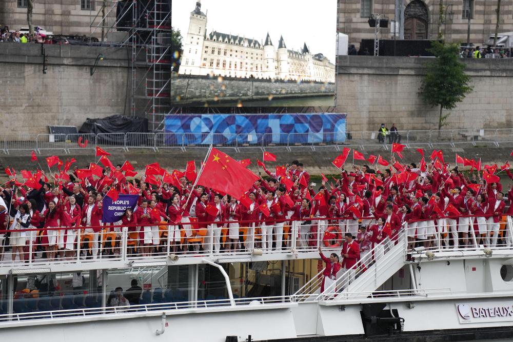 當地時間7月26日,第33屆夏季奧林匹克運動會開幕式在法國巴黎舉行。乒乓球運動員馬龍、花樣游泳運動員馮雨高擎五星紅旗,中國體育代表團運動員乘船在塞納河巡游。