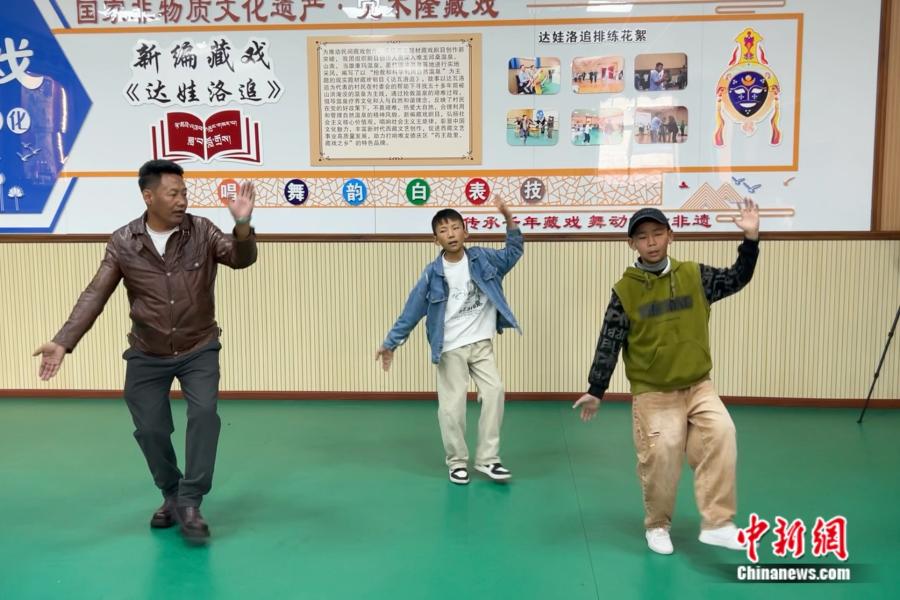 洛桑扎西現場指導藏戲小學員洛桑(右一)。 中新網記者 陳文韜 攝