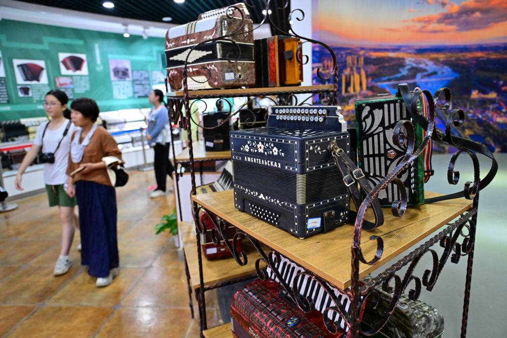 在伊犁哈薩克自治州伊寧市六星街,游客在亞歷山大手風琴珍藏館參觀(7月27日攝)。
