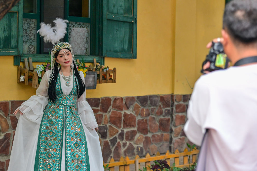 在伊犁哈薩克自治州伊寧市六星街,游客體驗旅拍項目(7月27日攝)。
