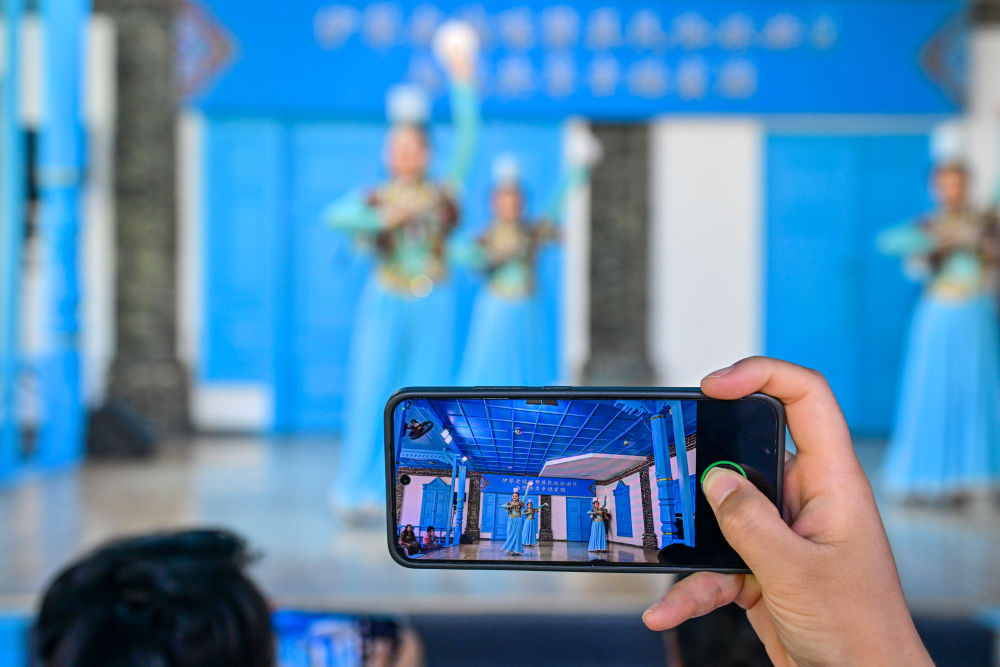 在伊犁哈薩克自治州伊寧市喀贊其民俗旅游區,游客在錫伯車馬店欣賞文藝表演(7月27日攝)。