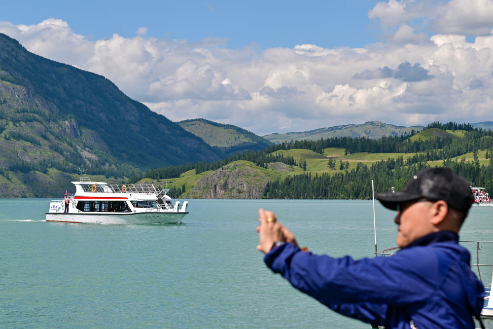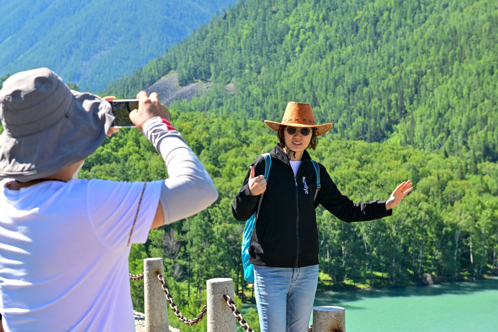 游客在新疆阿勒泰地區喀納斯景區觀光游覽(7月22日攝)。