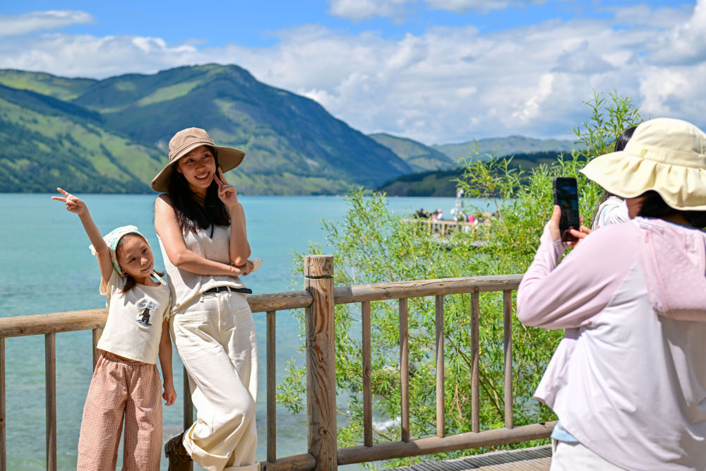 游客在新疆布爾津縣七彩河休閑旅游度假區拍照(7月21日攝)。