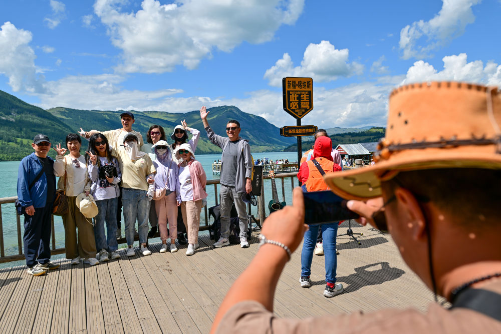游客在新疆阿勒泰地區福海縣烏倫古湖合影留念(7月21日攝)。