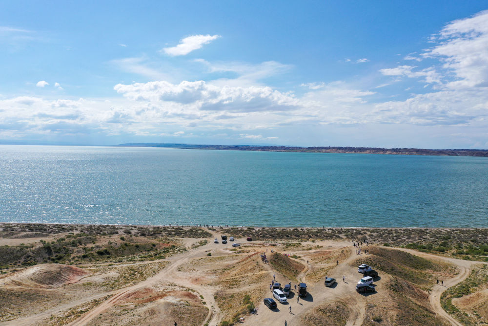 游客在新疆阿勒泰地區福海縣烏倫古湖觀光游覽(7月21日攝)。