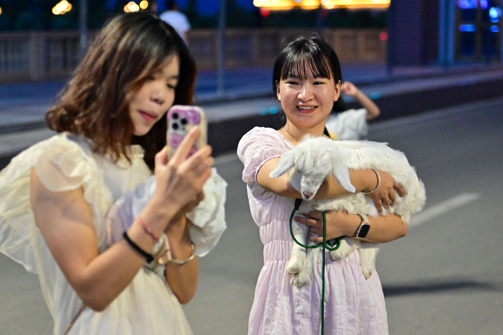 游客在新疆布爾津縣七彩河休閑旅游度假區抱著小羊拍照(7月21日攝)。