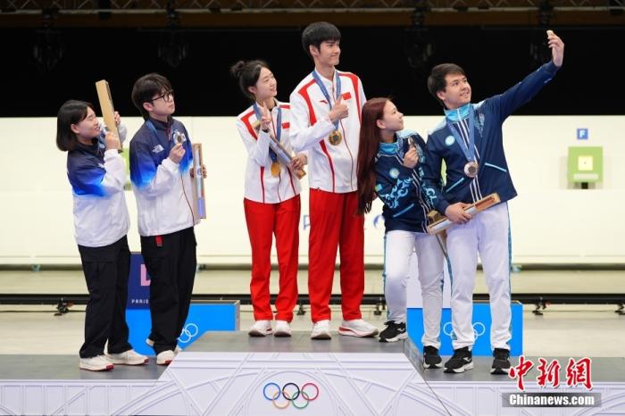 當(dāng)?shù)貢r間7月27日,在法國沙托魯舉行的巴黎奧運會射擊10米氣步槍混合團體決賽中,中國組合黃雨婷/盛李豪奪得金牌。這也是本屆巴黎奧運會誕生的首枚金牌。圖為獲獎選手在頒獎儀式上自拍。中新社記者 趙文宇 攝