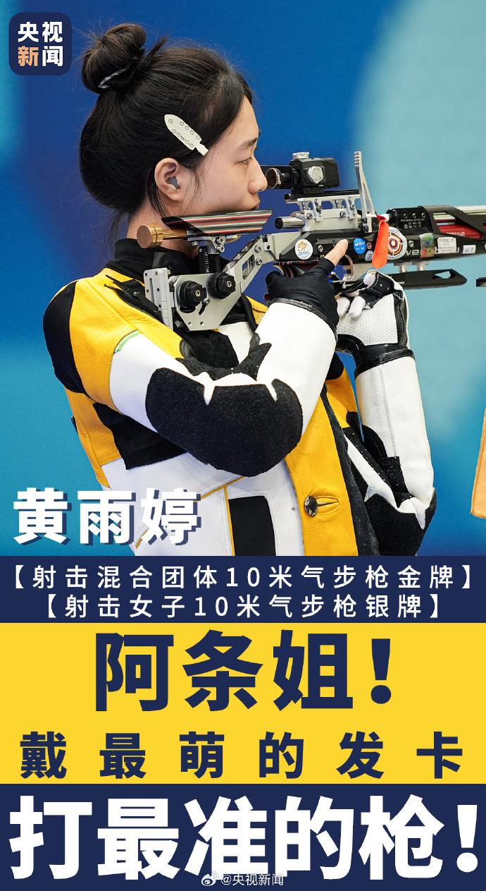 7月29日,在射擊女子10米氣步槍決賽中,“阿條姐”黃雨婷以0.1環之差獲得銀牌。