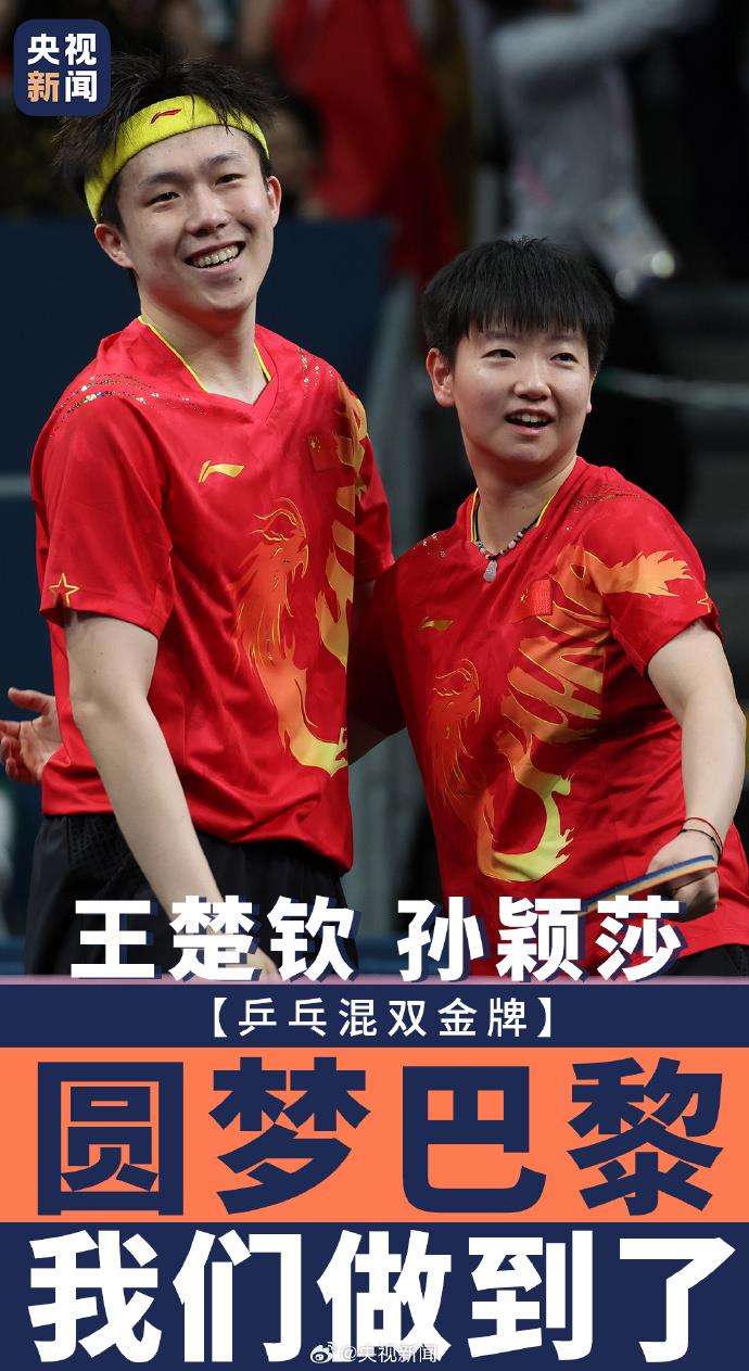 7月30日,在巴黎奧運會乒乓球混合雙打決賽中,中國組合王楚欽/孫穎莎4-2戰勝朝鮮組合,奪得金牌。“我們做到了!”東京的遺憾在巴黎畫上了一個圓滿的句號!