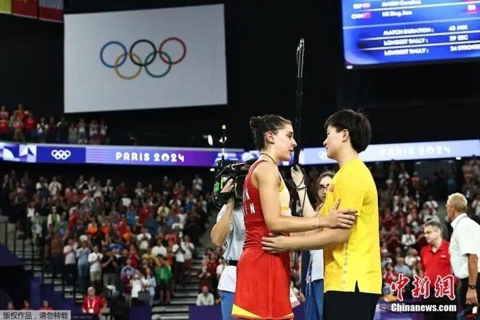 資料圖:當地時間8月4日進行的巴黎奧運會羽毛球女單半決賽中,西班牙名將馬林在比賽進行到第二局時因傷棄權,中國選手何冰嬌晉級女單決賽。圖為何冰嬌前去與馬林表示安慰。