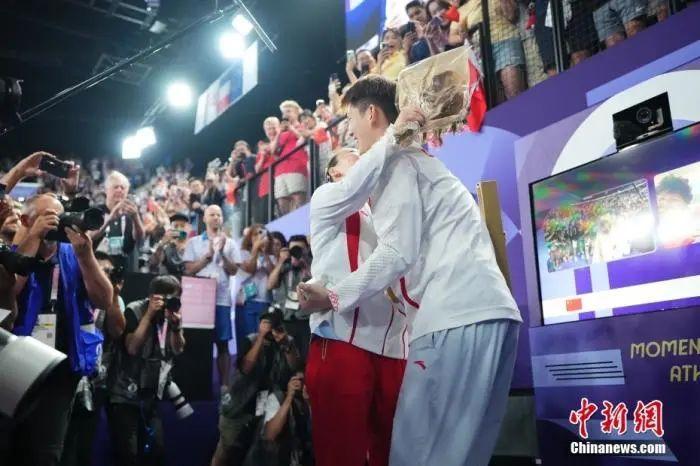 奪冠后的全紅嬋撲進教練陳若琳懷里,隨后又一路小跑奔向陳芋汐。在全世界的矚目下,兩位天才少女緊緊擁抱在一起。