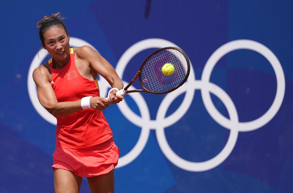 7月30日,鄭欽文在巴黎奧運(yùn)會網(wǎng)球女子單打第三輪比賽中回球。新華社記者 萬象 攝