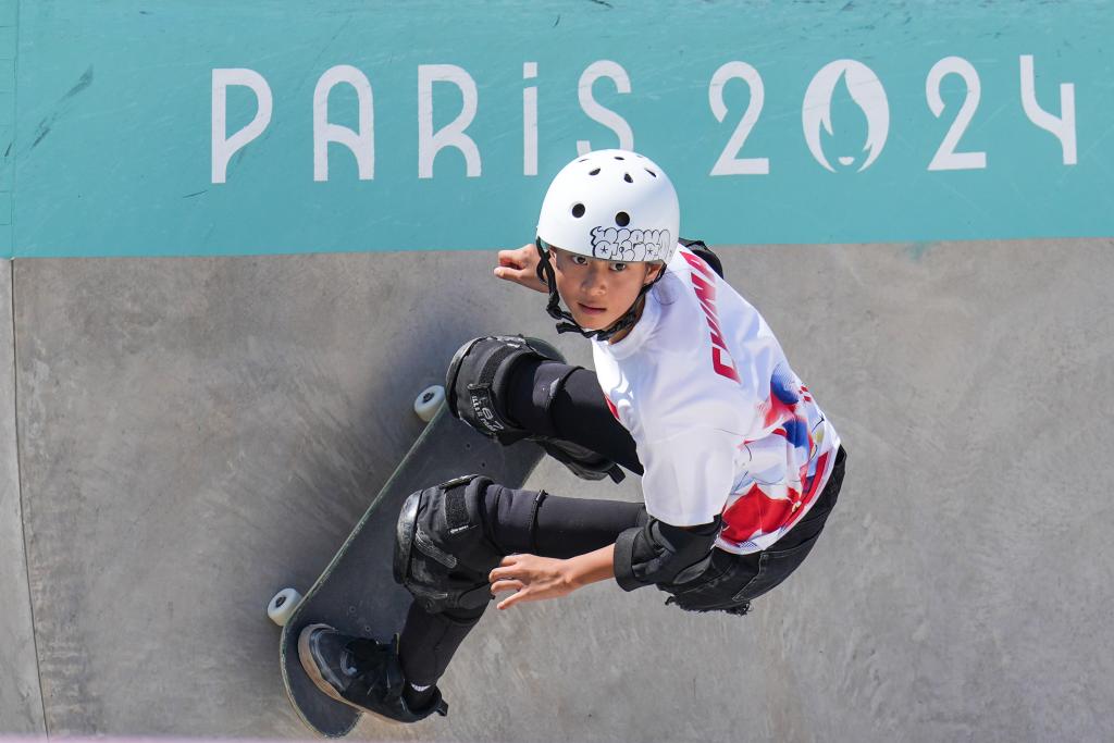 8月6日,中國選手鄭好好在巴黎奧運(yùn)會滑板女子碗池預(yù)賽中。新華社記者 杜宇 攝