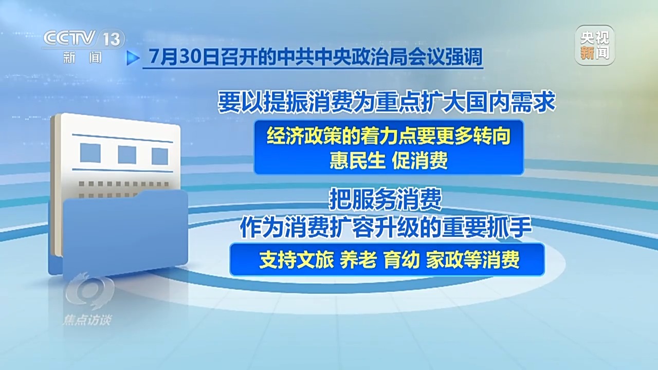 服務消費是釋放消費潛力的重要力量。7月30日召開的中共中央政治局會議強調,“要以提振消費為重點擴大國內需求,經濟政策的著力點要更多轉向惠民生、促消費,把服務消費作為消費擴容升級的重要抓手,支持文旅、養老、育幼、家政等消費。”國務院于8月3日印發《關于促進服務消費高質量發展的意見》,提出“著力提升服務品質、豐富消費場景、優化消費環境,以創新激發服務消費內生動能,培育服務消費新增長點”。這是我國首次專門就服務消費發展作出系統全面部署的政策文件。