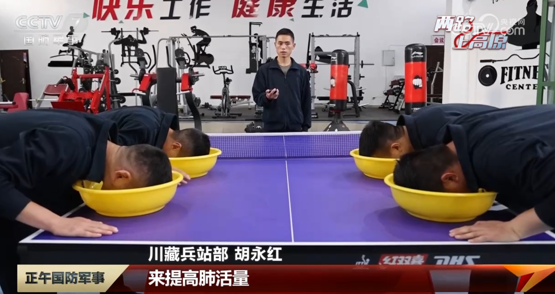 川藏兵站部胡永紅介紹:“首先大部分人初上高原,身體機能各方面,比如心臟這些都不適應高原的氣候,提前做抗缺氧操有利于適應高原的環境。一兩周之后,你可以慢慢適應去訓練,主要是心肺功能的訓練,平時我們也會進行水中憋氣來提高肺活量。日常我們也會注意改善自己的生活習慣,比如用腹式呼吸可以改善缺氧狀態。”