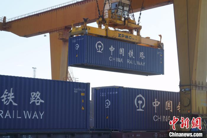 圖為龍門吊正將集裝箱吊往中越班列。王以照 攝