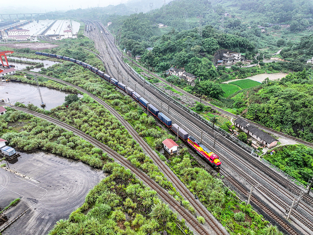 2024年6月27日,西部陸海新通道中老泰馬跨境鐵路班列在重慶江津小南埡站發車(無人機照片)。新華社記者唐奕攝