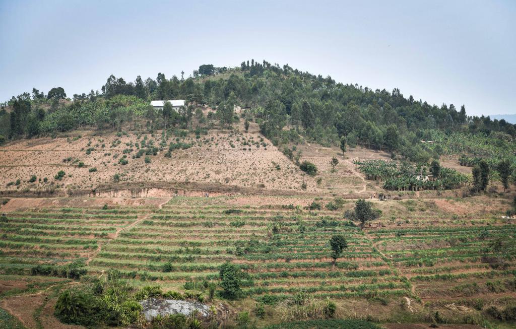 這是8月15日在盧旺達南方省拍攝的一處使用等高線種植巨菌草活籬笆和梯田套種農作物模式的水土保持田。