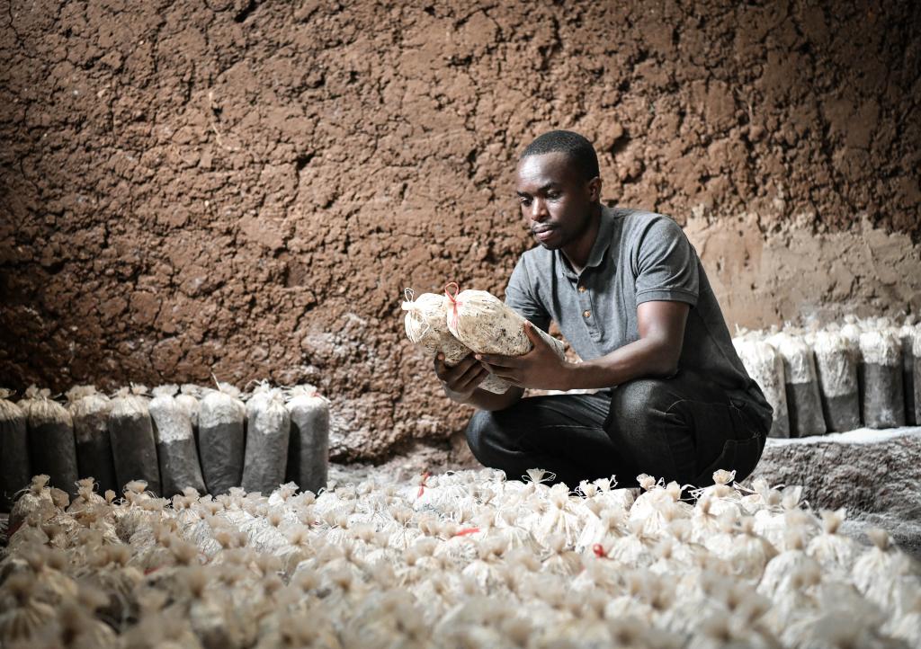 8月14日,在盧旺達南方省穆漢加區,尼揚博·奧貝德在食用菌培育工坊內檢查菌袋。曾兩次赴中國進行菌草技術培訓的尼揚博·奧貝德在南方省和東方省各擁有一家工坊。