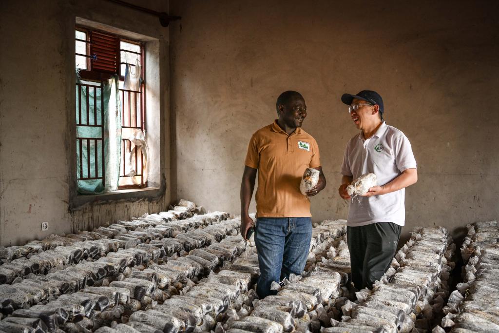 8月14日,在盧旺達南方省尼安薩區的一家食用菌培育工坊,菌草專家陳曉斌與工坊主人卡納尼·埃納尼交流。
