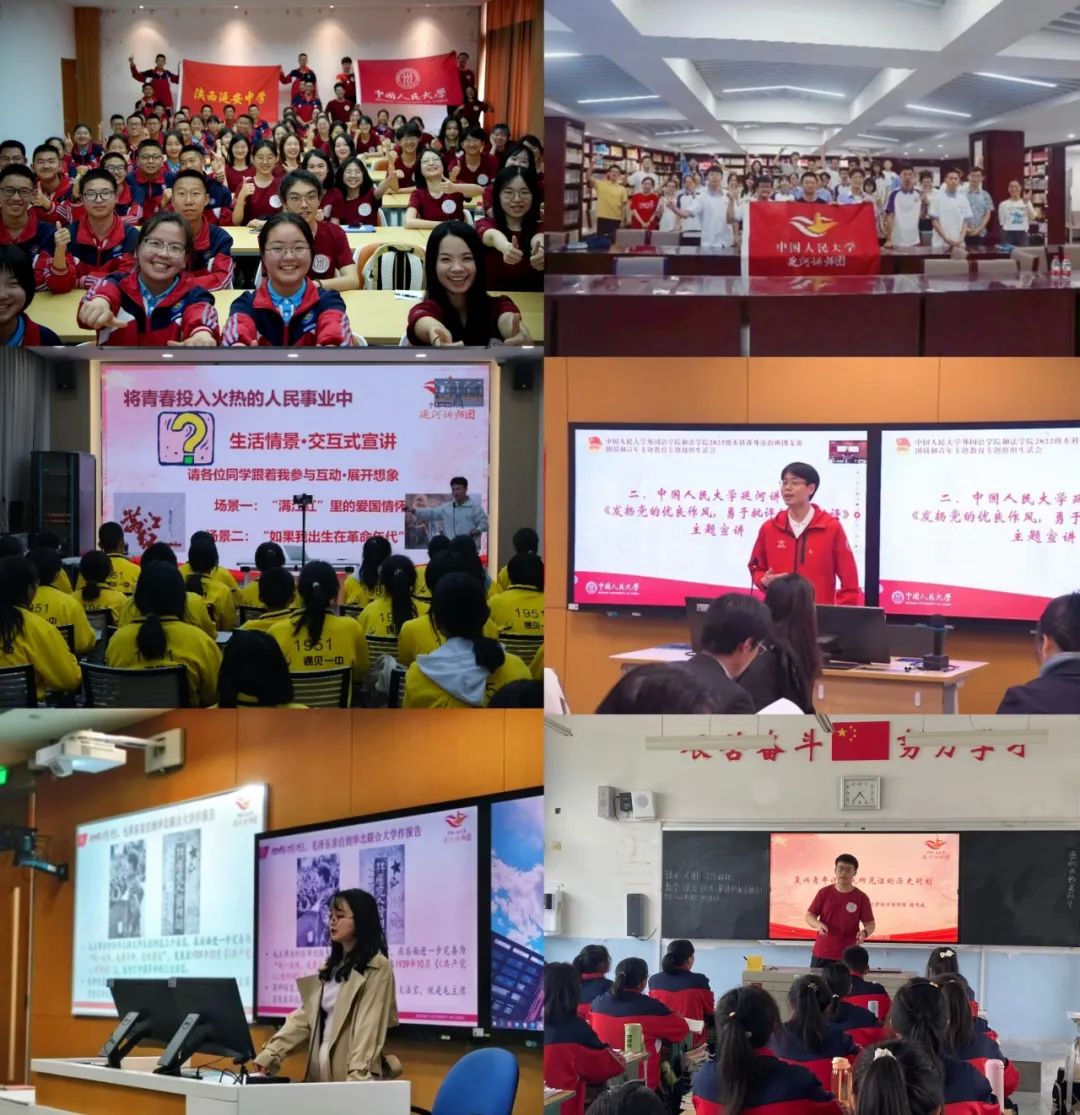2021年7月,中國人民大學組建延河講師團,打造一支大中小學思政教育一體化的青年宣講“輕騎兵”,以青年聲音宣傳黨的奮斗歷程和偉大成就、光榮傳統和優良作風、實踐創造和理論創新,講好“黨旗下的思政課”。現已推出7個專題、116門精品課程,以革命老區、脫貧摘帽地區、民族邊疆地區中小學校為重點,開展宣講活動600余場,覆蓋超過170萬人次、3000所學校。
