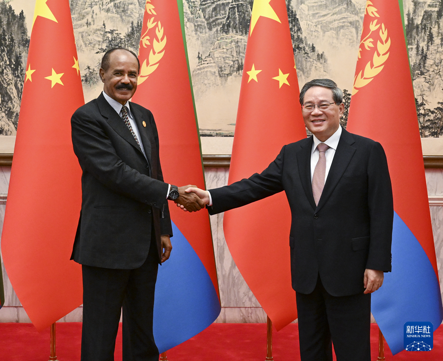9月3日上午,國務院總理李強在北京釣魚臺國賓館會見來華出席中非合作論壇北京峰會的厄立特里亞總統伊薩亞斯。新華社記者 饒愛民 攝