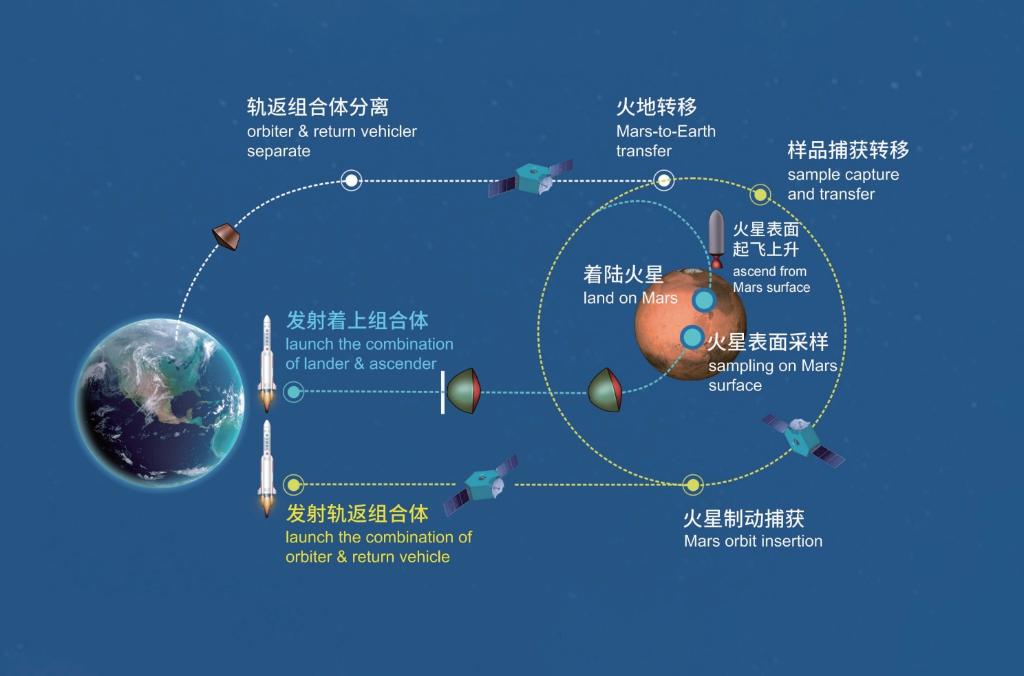 地月距離約38萬公里,而地球與火星的平均距離約4億公里。“火星比月球距離遠得多,環境也更加復雜。”劉繼忠介紹,受限于目前火箭的運載能力,原先通過一次發射實現月球取樣,但在火星取樣任務則需要兩次發射。中國計劃2028年在海南文昌用40天左右的時間,使用兩枚長征五號運載火箭,分兩次發射天問三號的軌道器、返回器組合體和著陸器、上升器組合體。