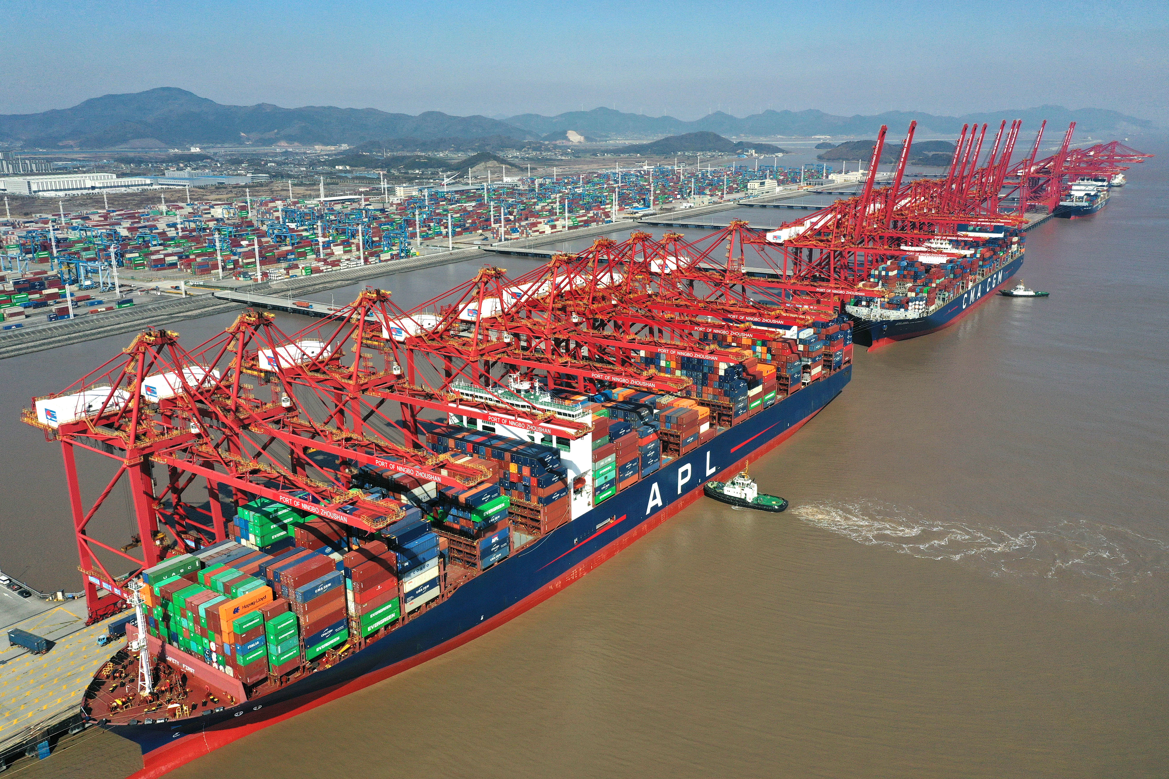 貨輪停靠在浙江寧波舟山港梅山港區碼頭(2024年1月24日攝,無人機照片)。新華社記者 黃宗治 攝