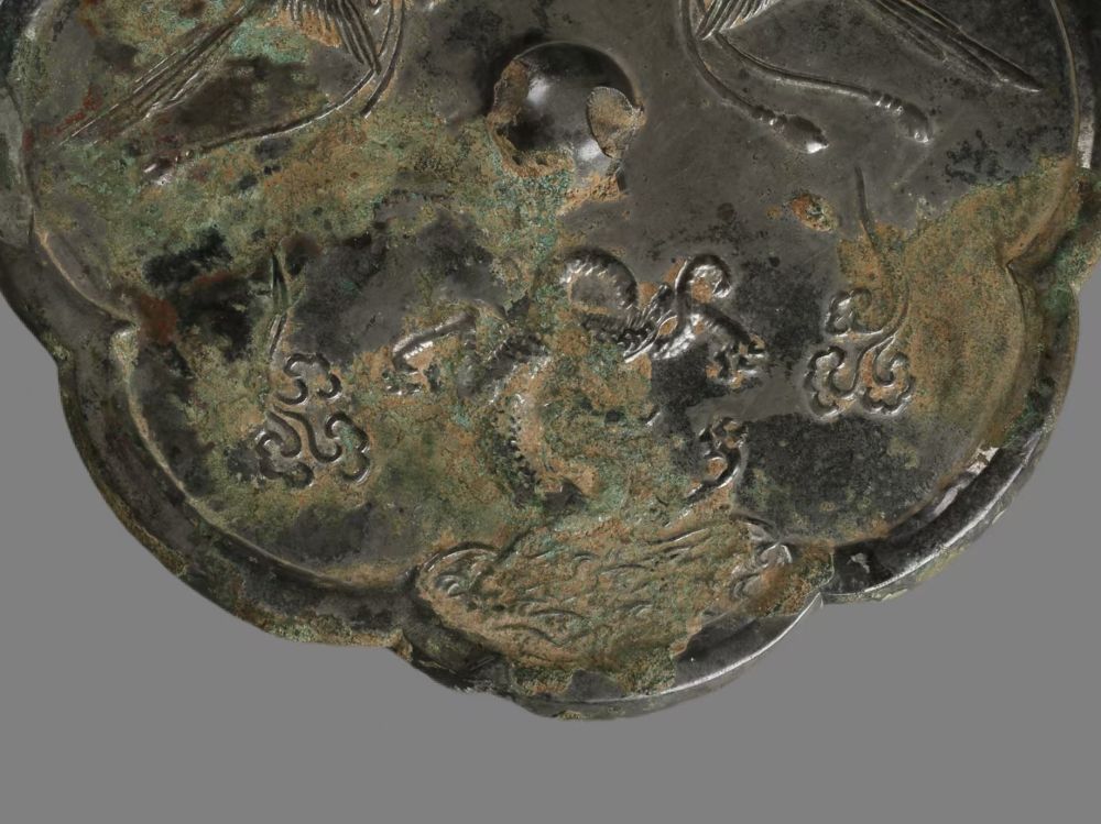 銅鏡呈八瓣葵花形,在中央的鏡鈕四周,自下而上分三個部分構成了由水面到天空的立體空間。最下層為波光粼粼的一汪水面,雖然這一部分留存有因長期埋藏地下而產生的銹跡,但仍依稀可辨碧波之上有一條昂首翹尾的龍。它四肢張開,龍尾反折向龍首上方并纏繞于一足之上,龍身兩側各一朵祥云,襯托出神龍騰躍翻飛的身姿。