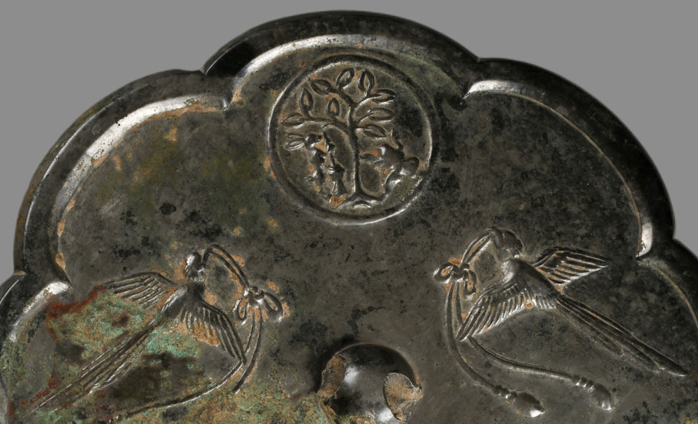 畫面中部鏡鈕兩側,是兩只口銜綬帶的鳥兒。它們拖著長長的尾羽,雙翅伸展相對飛舞,口中的綬帶飄逸飛揚。在它們的目光交匯處,是這組畫面的主題:月宮。