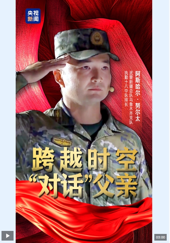 21日晚《把青春華章寫在祖國大地上》大思政課網絡主題活動現場,投筆從戎的南開學子阿斯哈爾 · 努爾太,通過AI技術穿越時空與父親對話。阿斯哈爾獻給父親的一個軍禮,令無數人動容。