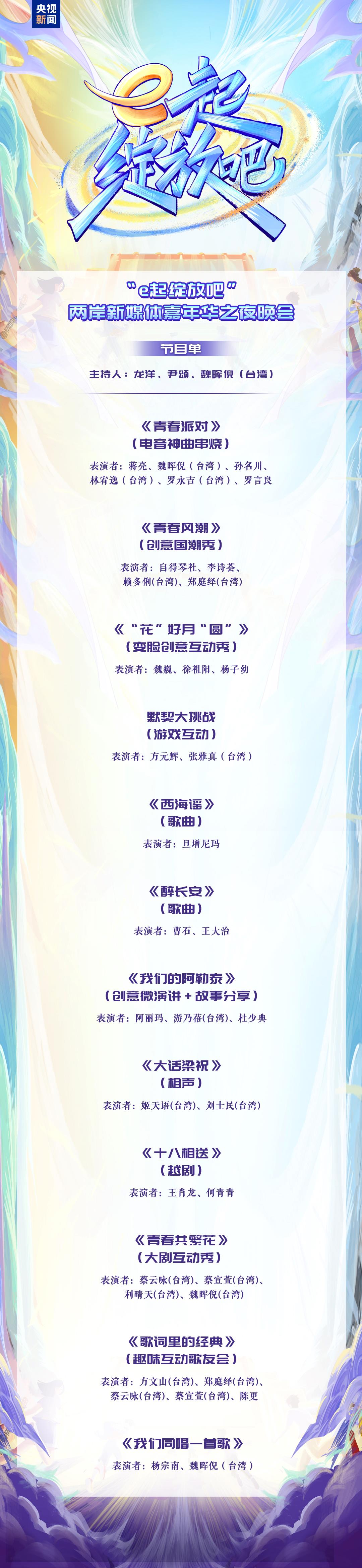 “e起綻放吧”兩岸新媒體嘉年華之夜晚會今晚(9月25日)20時將在看臺海、大灣區之聲、央視頻、央視新聞、央視財經等平臺播出。來自兩岸的文化名人、網紅博主、青年代表以“才藝+故事”的融合表現形式,結合影視劇、國潮音樂、舞蹈、詩詞歌賦、旅游美食等文化元素,共尋文化記憶、共話青春故事、共融民族情感,共享一場心手相牽的青春盛宴。兩岸年輕人在晚會中同唱一首歌、同追一部劇、同創一首詩,展現兩岸交流交往、融合發展中的蓬勃青春力量。