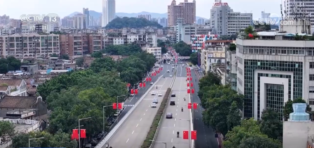 在廣東深圳,公園、廣場、街道上,處處可以看到五星紅旗迎風飄揚。紅旗與藍天、綠樹、高樓交相輝映,為城市增添了濃濃的節日氛圍。