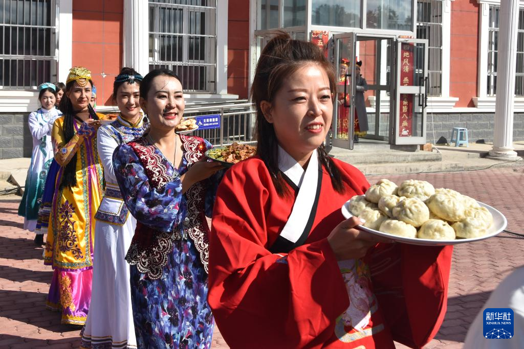 9月27日,在新疆塔城市新城街道哈爾墩社區(qū)舉行的“鄰里節(jié)百家宴”現(xiàn)場(chǎng),社區(qū)居民展示自己制作的美食。