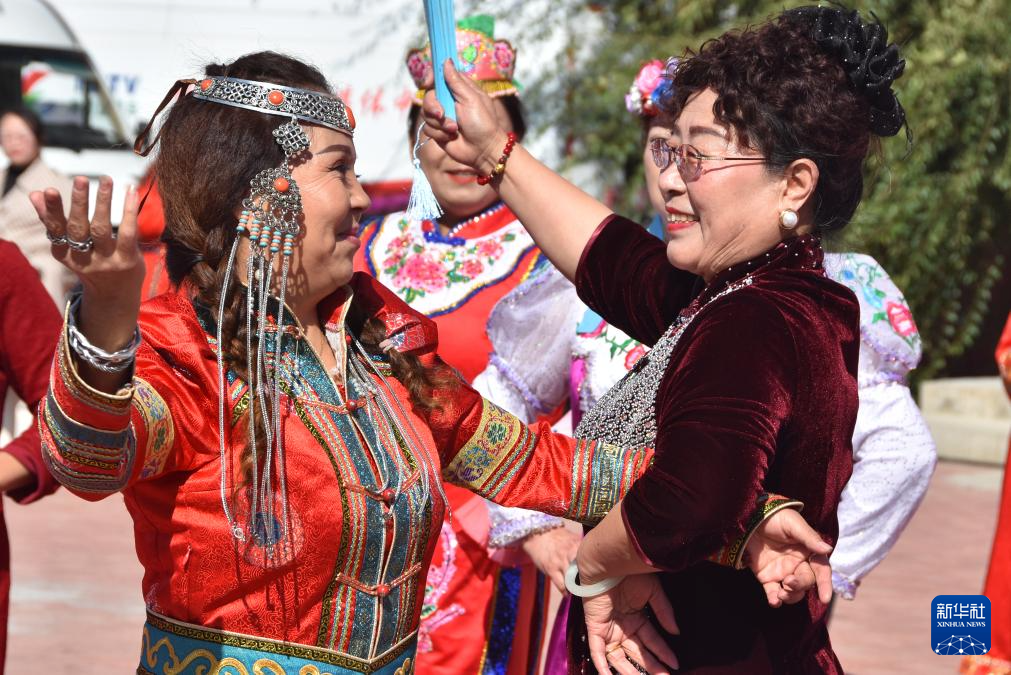 9月27日,在新疆塔城市新城街道哈爾墩社區(qū)舉行的“鄰里節(jié)百家宴”現(xiàn)場(chǎng),社區(qū)居民在表演。