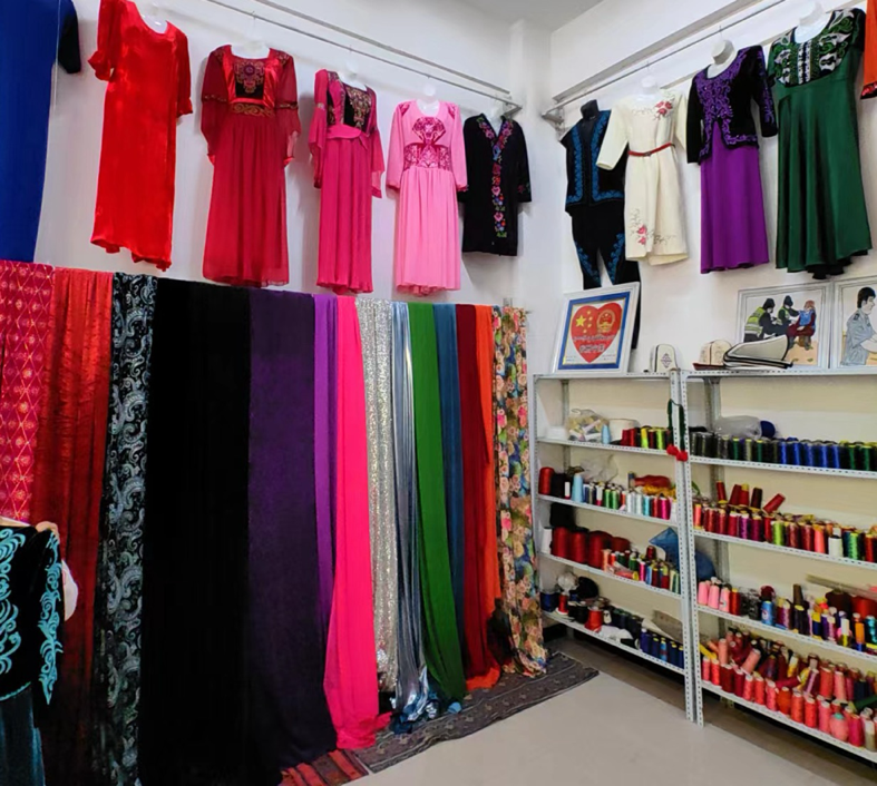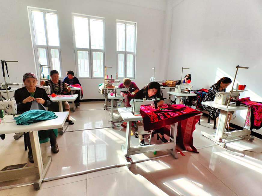 托云牧場積極鞏固政策支持,集中力量打造項目驅動,有效推進地方產業(yè)集群的全面發(fā)展,實現(xiàn)經營集約化與產業(yè)高效整合。2015年,由牧場“刺繡巧匠”吐孔·沙熱牽頭并成功注冊了“托云牧場帕米爾刺繡”合作社。到了2019年,牧場成功申請到160萬元援疆資金,用于建設新的手工刺繡產品生產基地。在吐孔·沙熱的帶動下,合作社目前擁有60名成員,其中43名技藝嫻熟的繡工,年總收入攀升至三十萬。該合作社通過直銷、與克州百來思服裝店的業(yè)務合作,以及接受附近學校的校服訂單等多種渠道,將其生產的床品、家居布藝、女性服裝及校服推向阿圖什市、烏恰縣等地區(qū)市場。