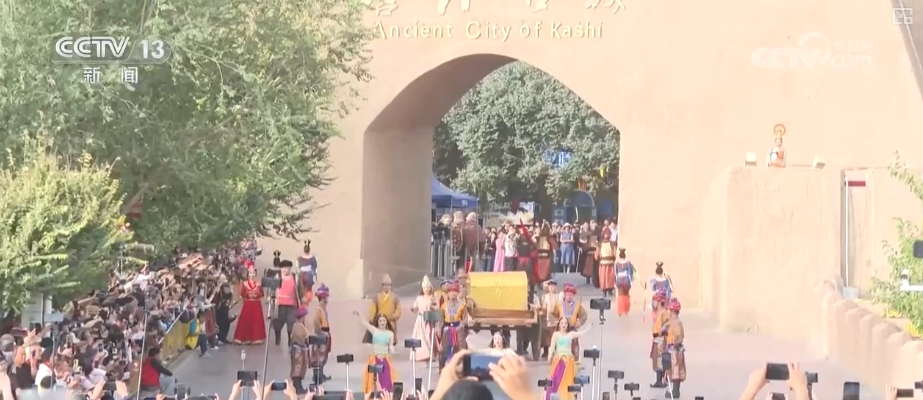 一大早,喀什古城的開城儀式迎來四面八方游客,具有喀什濃郁特色的開城迎賓舞吸引成千上萬的拍客們爭相拍攝。傍晚時分,在喀什古城街道的游客們感受著國慶節日來臨前的歡樂喜慶氛圍。