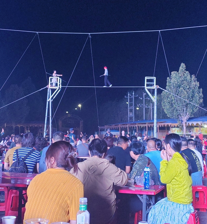 夜幕降臨,華燈初上,阿克蘇老街夜市美食與文化的融合相得益彰。特色烤包子、烤全羊、抓飯、肚包肉等美食的香氣與攤主的叫賣聲交織在一起;民族樂器、木盤、木碗、木勺等非遺產品,既有滄桑感,更有文化味;達瓦孜表演中,兩名演員在手持平衡桿,在高空繩索上表演前后走動、盤腿端坐、蒙眼行走、飛身跳躍等一系列驚心動魄的技藝,引得觀眾拍手稱絕;賽乃姆、龜茲樂舞等讓人們感受到了中華文化的魅力和深厚底蘊。