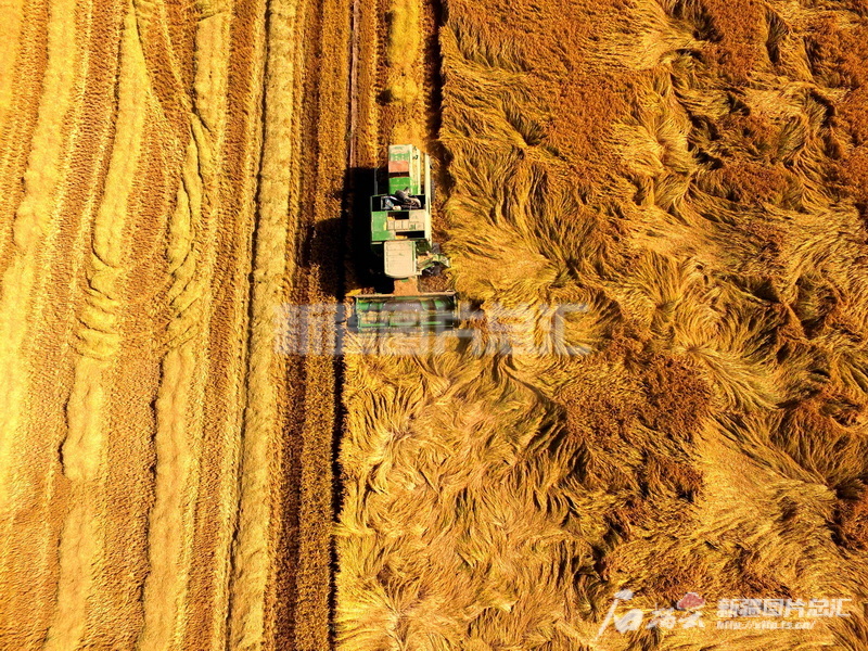2016年10月11日,新疆生產建設兵團第一師原阿拉爾農場職工在收割水稻。王志清攝
