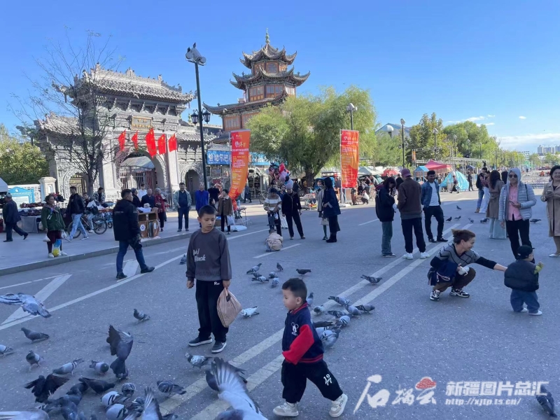 伊寧市喀贊其民俗旅游區(qū)游人與鴿子嬉戲。石榴云/新疆日?qǐng)?bào)記者姚剛攝