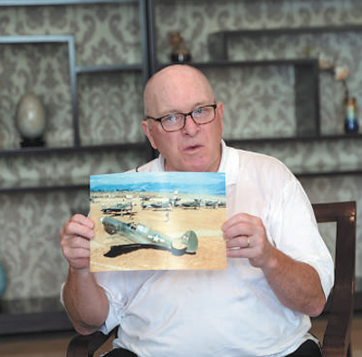小克利福德·隆展示其父親曾駕駛的戰斗機照片。