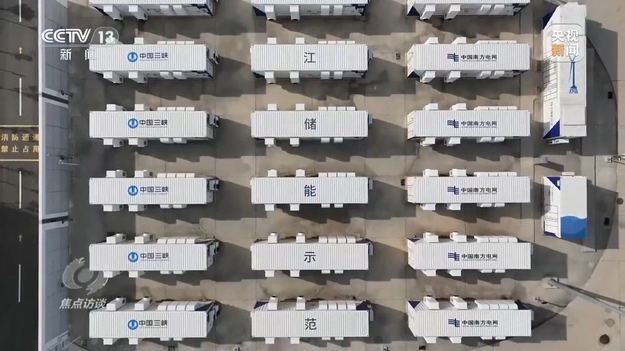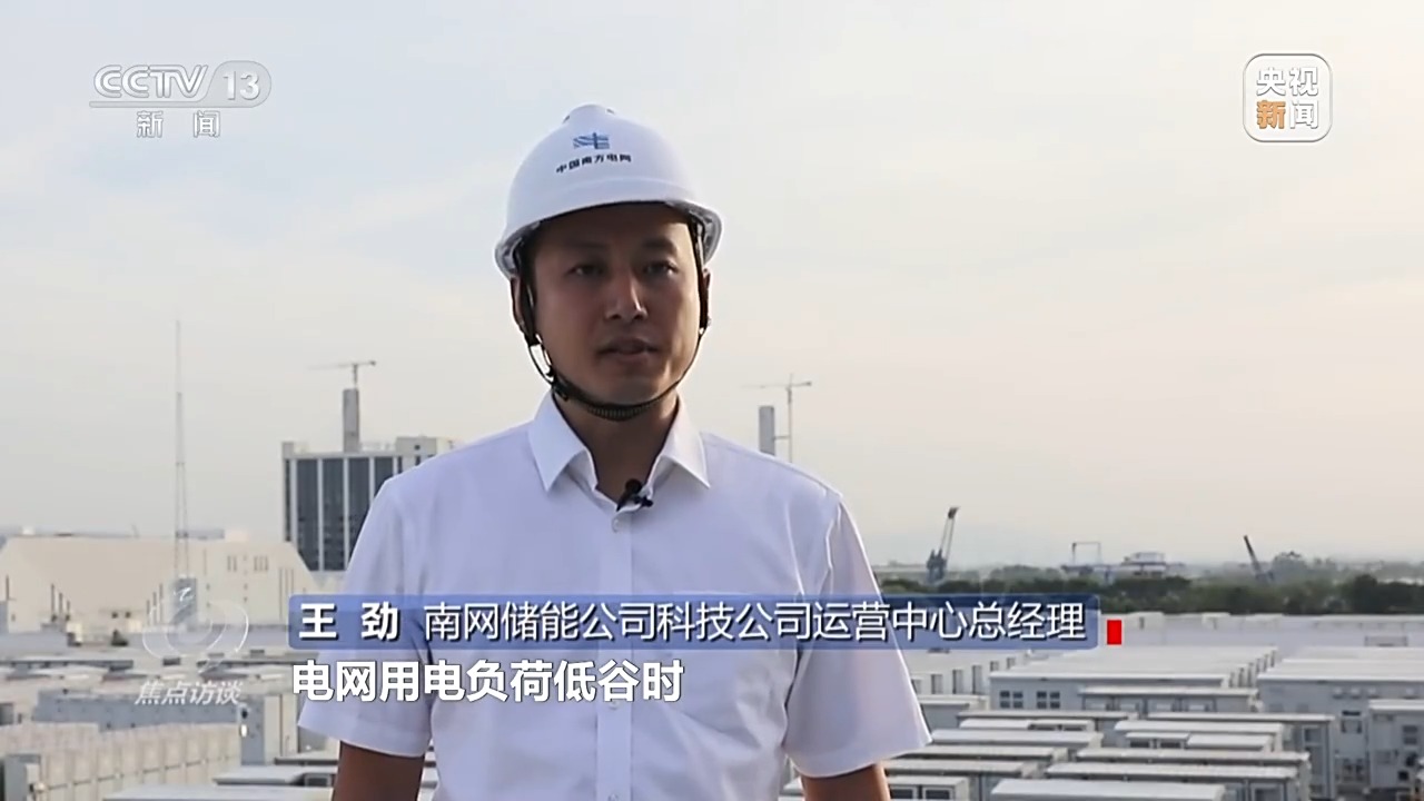 南網儲能公司科技公司運營中心總經理 王勁:電網用電負荷低谷時,把電廠發出的多余的電儲存到250個電池儲能柜內,用電高峰時,把電池儲能柜里的電能釋放出來支持電網的電力供應。