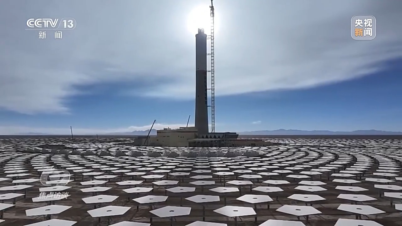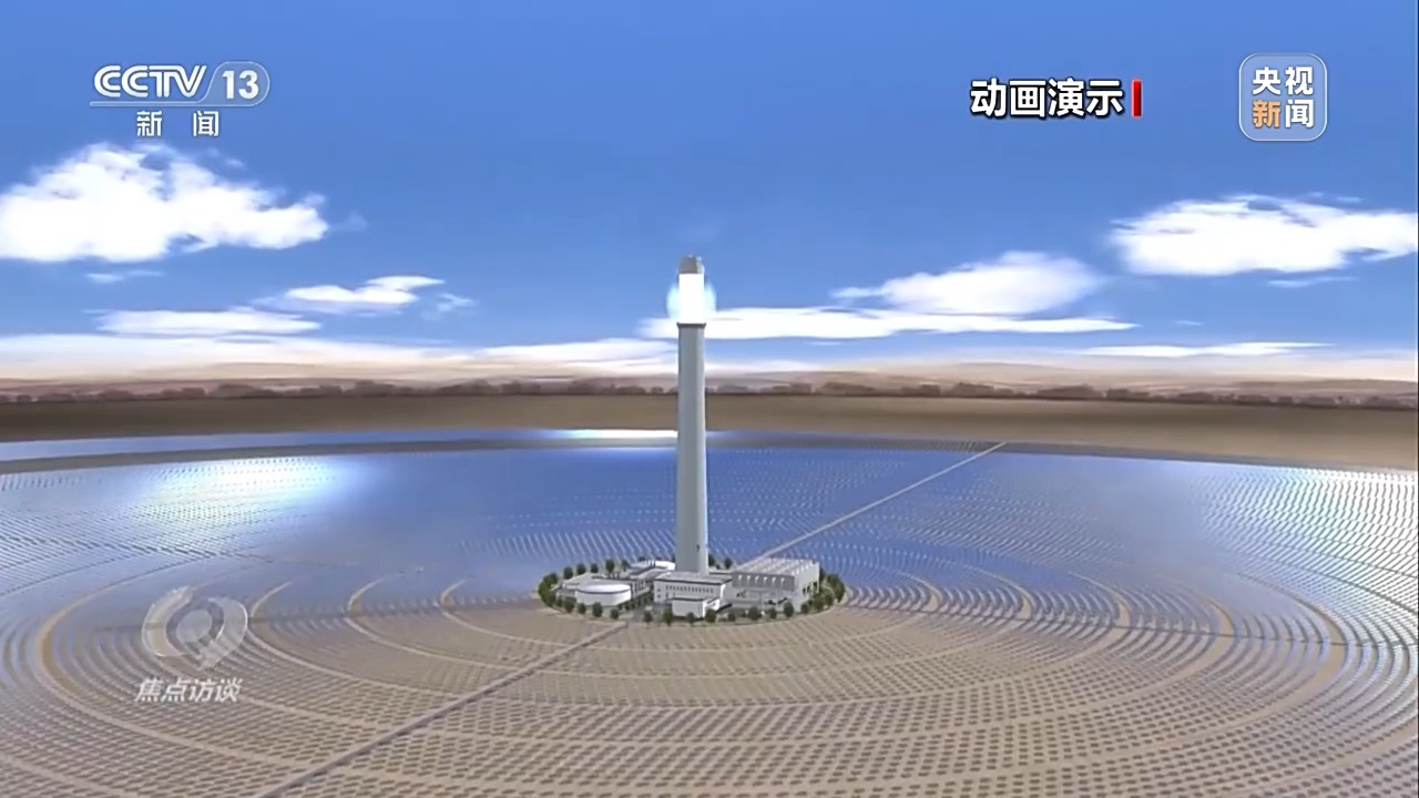 電站通過高精度智能定日鏡,實時跟蹤太陽的運動,將太陽直接輻射光反射聚集到吸熱塔上,將吸熱塔內的熔鹽加熱到560多℃的高溫,將高溫的熔鹽進行儲存,在需要發電時再通過高溫熔鹽與水進行熱交換,產生高溫高壓的蒸汽,驅動汽輪發電機組發電。