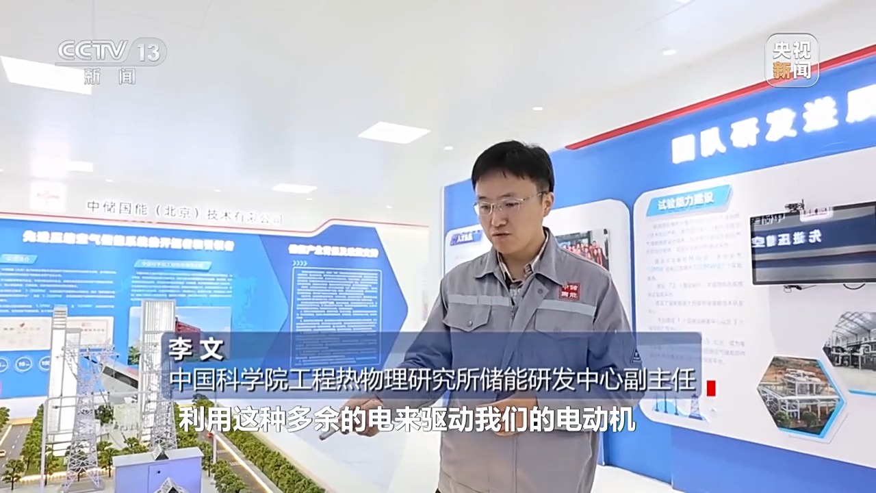 中國科學院工程熱物理研究所儲能研發中心副主任 李文:利用多余的電來驅動電動機,帶動壓縮機把空氣壓縮到高壓狀態,最后存儲到儲氣裝置中,在有需要的時候,我們利用所存儲的高壓空氣來驅動膨脹機,帶動發電機進行做功發電。