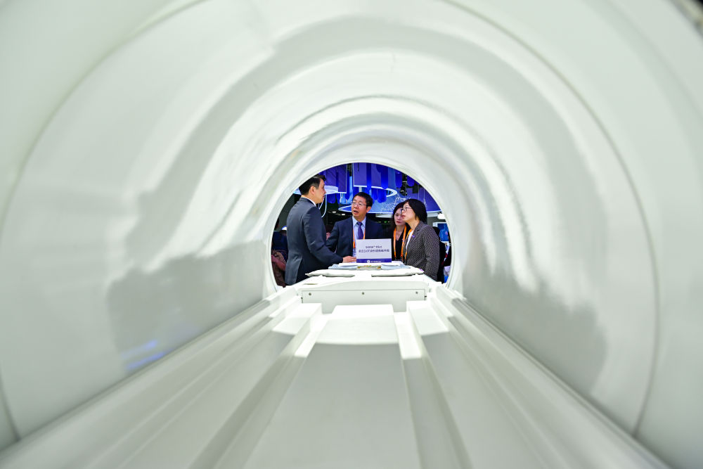 11月5日,人們在第七屆進博會醫療器械及醫藥保健展區GE醫療展臺了解一款讀秒成像磁共振儀器。新華社記者 張鋮 攝