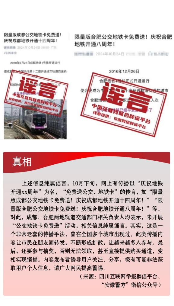 假冒官方虛構(gòu)政策。一些不法分子冒充權(quán)威機構(gòu),散布涉公共政策類謠言,誤導(dǎo)公眾認知。有的假借官方名義,偽造政策文件,實則行騙牟利,侵犯群眾利益。如有人利用公眾對“大數(shù)據(jù)”“數(shù)字經(jīng)濟”等內(nèi)容的認知盲區(qū),假借“國家數(shù)據(jù)局”“中國人民銀行數(shù)字貨幣研究所”等官方名義,偽造政策文件,謠稱“國家數(shù)據(jù)局頒發(fā)‘個人數(shù)據(jù)資產(chǎn)擁有權(quán)確權(quán)憑證’”“數(shù)字人民幣平臺將發(fā)放‘?dāng)?shù)字資產(chǎn)紅利’”,相關(guān)部門均已發(fā)布辟謠聲明。有的從公開發(fā)布的政策信息中摘取碎片化信息,斷章取義,對政策歪曲解讀。如個別自媒體故意混淆“個人養(yǎng)老金”與“基本養(yǎng)老金”的概念,傳播“領(lǐng)取養(yǎng)老金要繳3%個稅”“養(yǎng)老金個稅起征點為5000元”等不實信息,引發(fā)公眾誤解。另有“成都、合肥等地免費送公交地鐵卡”謠言,以“免費”“贈送”為噱頭,誘導(dǎo)用戶關(guān)注、分享,最終可能導(dǎo)致用戶遭受個人信息泄露或其他不法侵害。