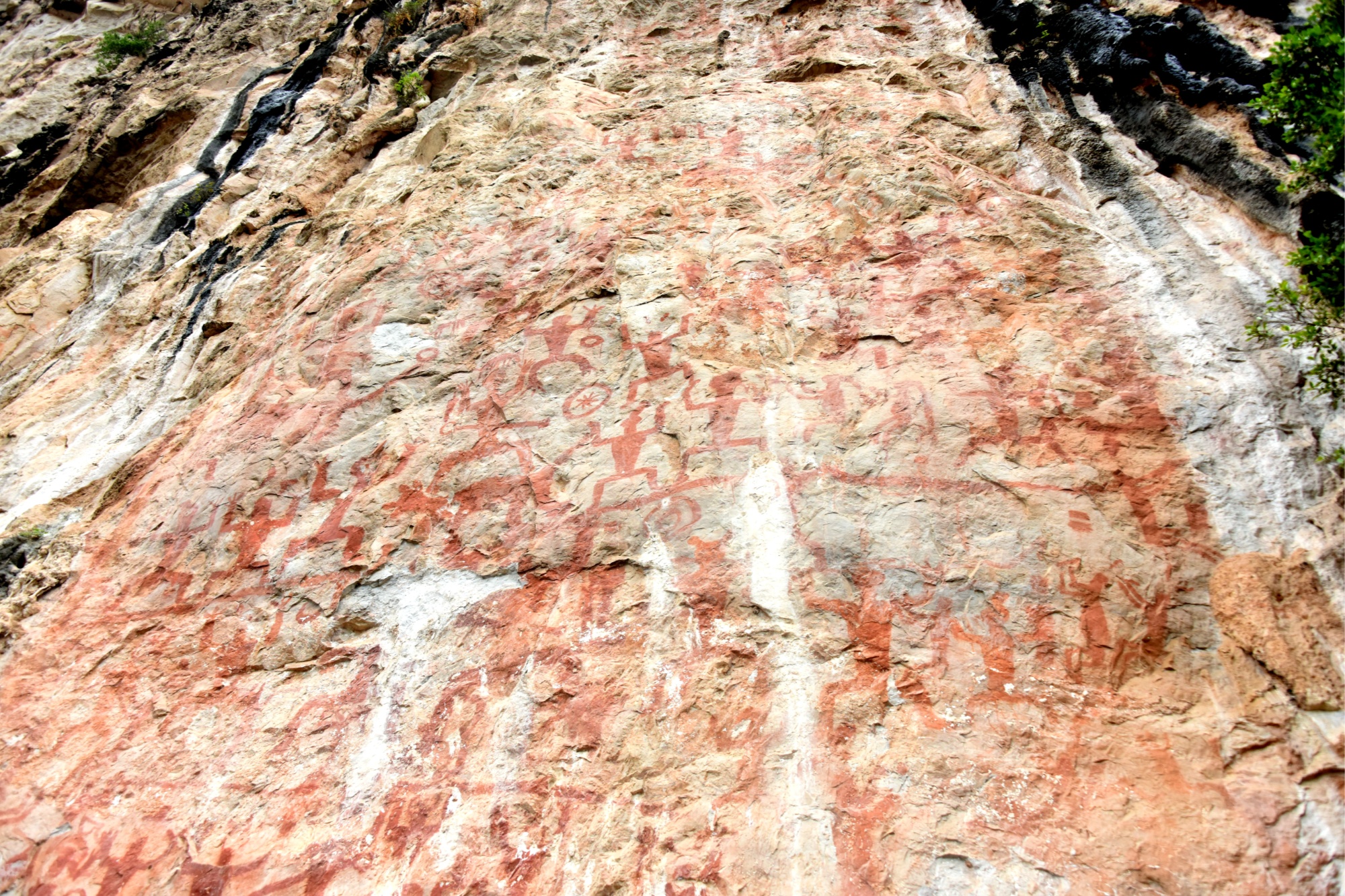 花山,坐落于崇左市寧明縣城西北約25公里的明江河畔,以其古老神奇的巖畫而聞名海內(nèi)外。花山巖畫距今已有2000多年的歷史,刻著人、獸、銅鼓、刀劍、羊角鈕鐘等造型各異的赭紅色圖像,記錄著壯族先民古駱越人的生活、生產(chǎn)和宗教信仰,為中國首個巖畫類世界文化遺產(chǎn)。