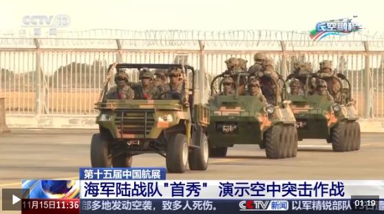 第十五屆中國航展是海軍陸戰隊員首次參加,除了演示艦載直升機飛行課目,還有搭載全地形山貓突擊車及多名陸戰隊員進行快速突擊,奪控敵目標的課目。